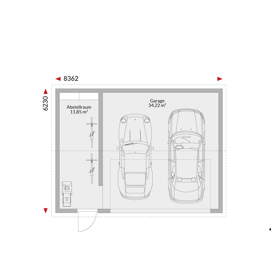 Doppelgarage mit Satteldach und Abstellraum Grundfläche gesamt: 46,07 m² Garage 34,22 m², Abstellraum 11,85 m² Außenmaße 8,362 m x : 6,23 m Tor und Tür traufseitig