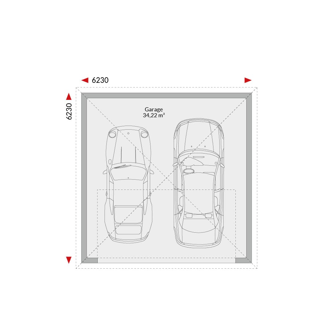 Doppelgarage mit Walmdach Grundfläche: 34,22 m² Außenmaße: 6,23 m x 6,23 m