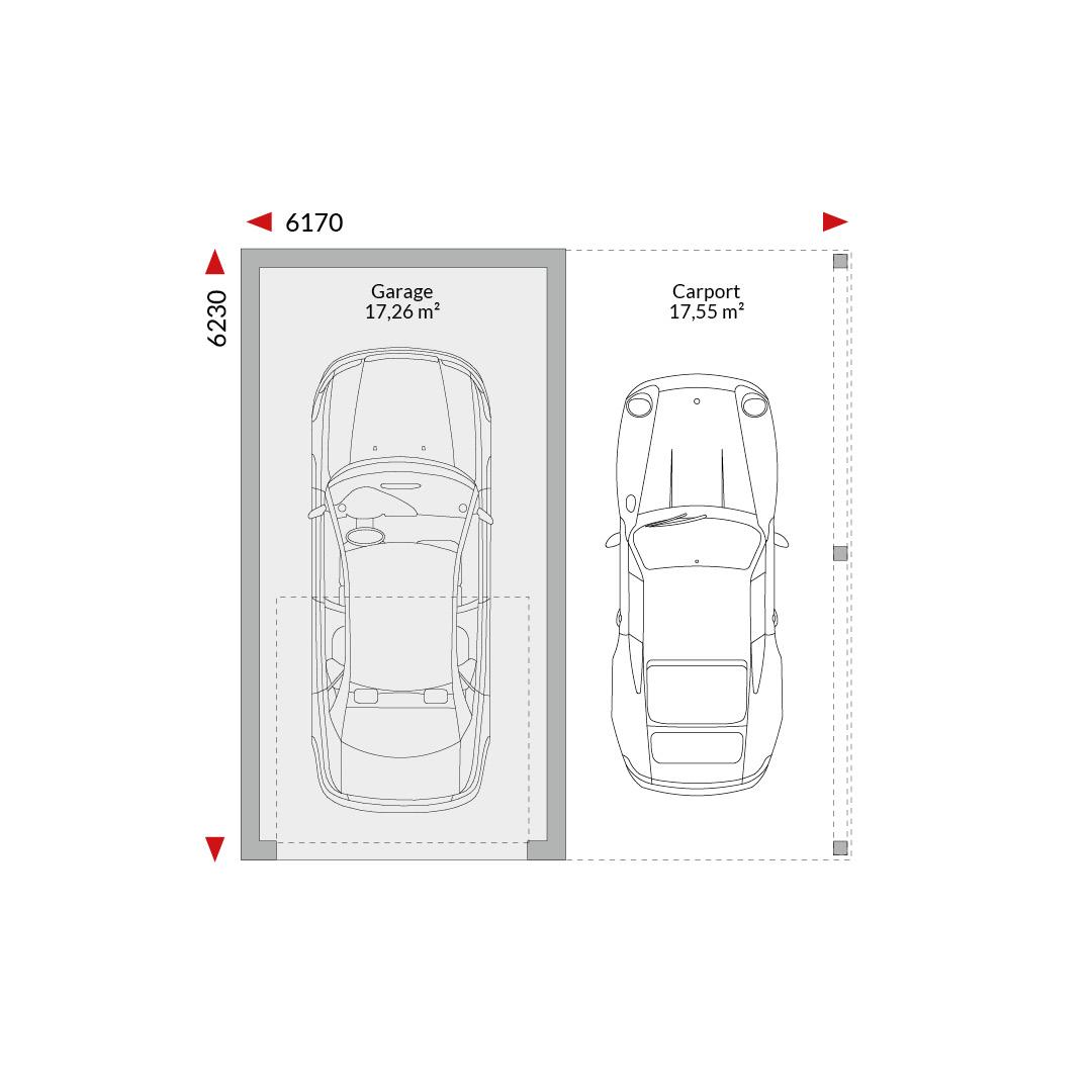 Einzelgarage mit Flachdach und integriertem Carport Grundfläche gesamt: 34,81 m² Garage 17,26 m², Carport 17,55 m² Außenmaße: 6,17 m x 6,23 m