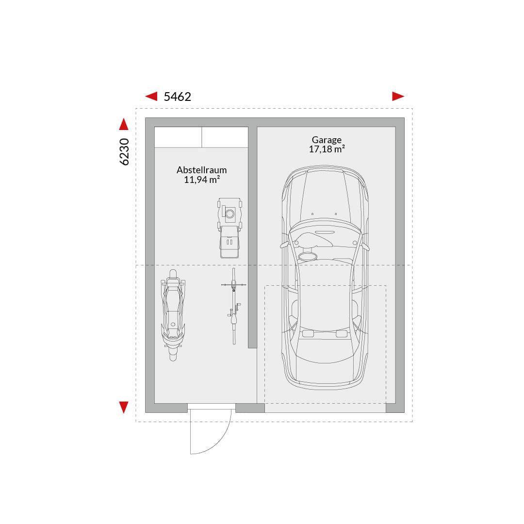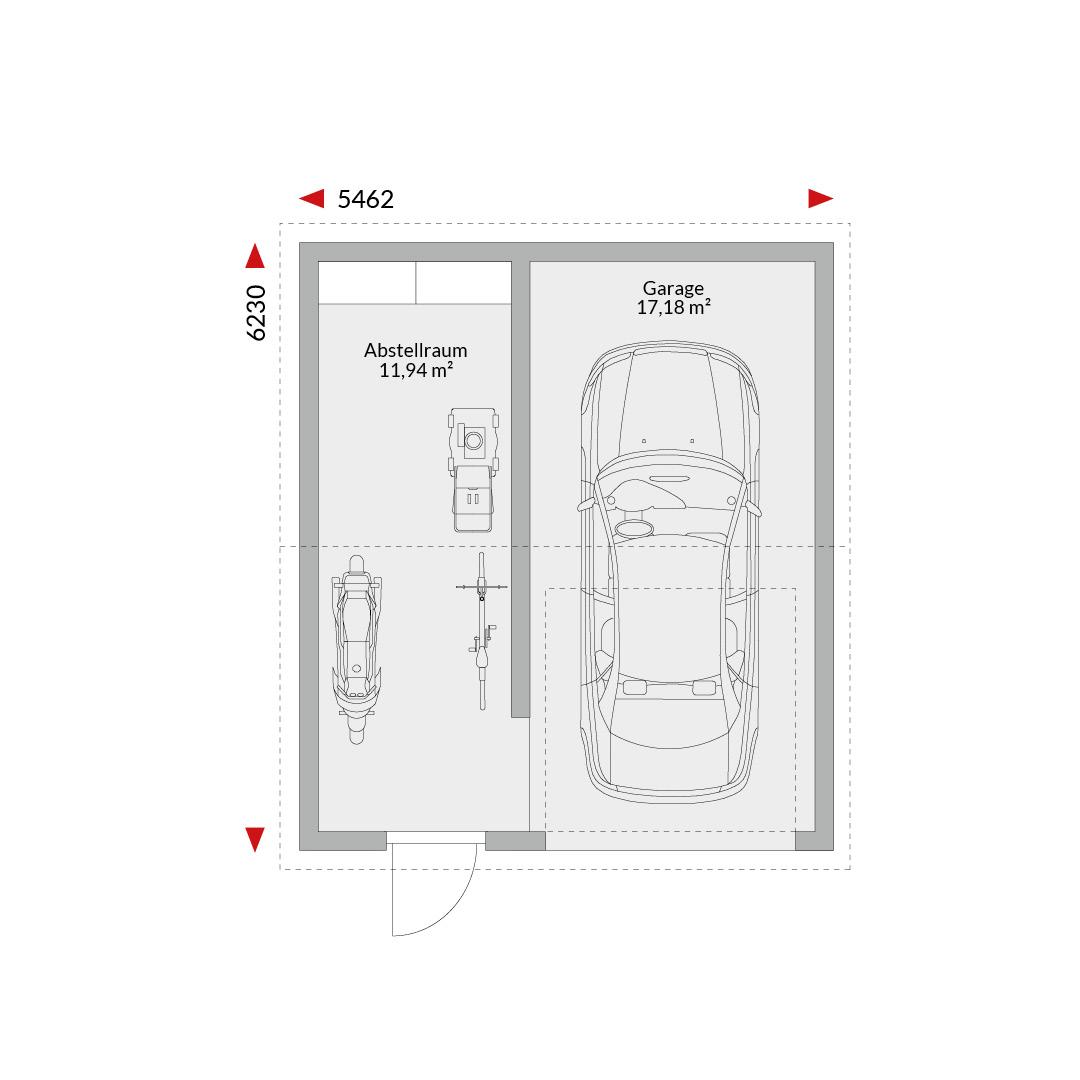 Einzelgarage mit Satteldach und Abstellraum Grundfläche gesamt: 29,12 m² Garage 17,18 m², Abstellraum 11,94 m² Außenmaße: 5,462 m x 6,23 m Tor und Tür giebelseitig