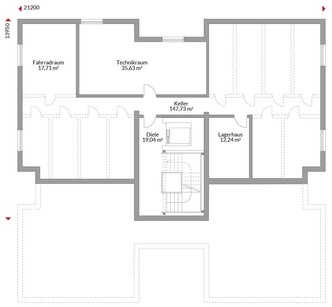 Dreivollgeschossiges Mehrfamilienhaus (19 635 m x 21 280 m, Gesamtnutzfläche 1099,43 m²) mit zehn Wohneinheiten von rund 60 m² bis zirka 89 m². Flachdach. Kein Stellflächenverlust im OG. Erdgeschoss und 1. Obergeschoss vier Wohnungen. Obergeschoss zwei Wohnungen. Kellergeschoss mit Technik- und Fahrradraum sowie Lagerflächen für jede Wohnung. Aufzug vom Keller ins OG.