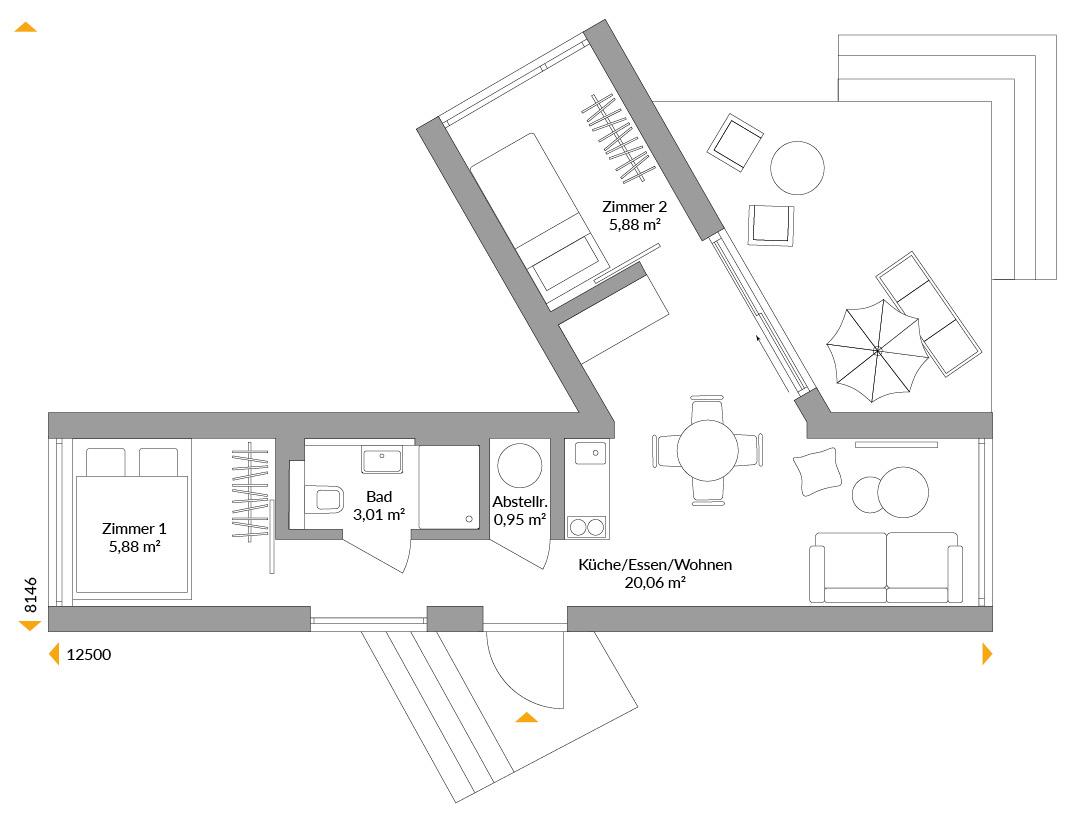 Als dritte Variante zu den beiden vorbeschriebenen Mini-Häusern aus schmalen S-Modulen präsentiert präsentiert ‚sich das knapp 36-Quadratmeter-Domizil in naturfarbener Lamellenverkleidung. Die großen Verglasungen bieten herrliche Aussicht in alle vier Himmelsrichtungen. Auch bei diesem Haus ist dank eines angedockten Flügels ein zweites Schlafzimmer vorhanden und im Übergang zwischen beiden Modulen Platz für einen Esstisch.