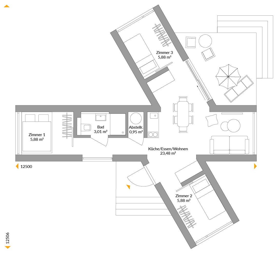An ein UFO erinnert diese Version aus S-Modulen mit zwei Seitenflügeln. Drei Schlafzimmer aber bieten irdischen Komfort. Da jedes Schlafzimmer durch eine verglaste Wand gekrönt wird, wirkt das kleine Haus recht großzügig und kommt die Natur quasi ans Bett. Auf 45 Quadratmetern finden außerdem eine Mini-Küche, ein Duschbad und der Technikraum Platz. Im Zentrum des Hauses können sich alle am Esstisch versammeln. Von hier führt auch die große Schiebetür auf die Terrasse. Als Ferienhaus perfekt für Familien, zum Dauerwohnen mit Arbeits- und Gästezimmer für Singles und Paare geeignet.