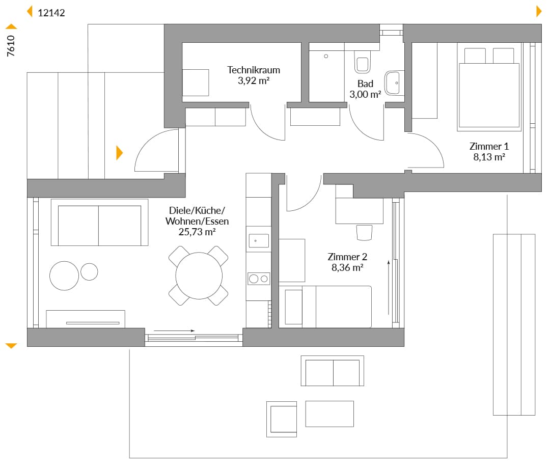 Ein Modulbungalow mit zwei Winkeln, zwei Schlafzimmern und einem großzügigen Koch-, Ess- und Wohnbereich lädt zum entspannten Wohnen auf kleinem Raum ein. Knapp 50 Quadratmeter für einen Single-Haushalt, der hier sogar Besuch empfangen oder sich sein Arbeits- oder Hobbyzimmer einrichten kann, sind ein luxuriöses Angebot. Als Weekend-Oase ist dieses Kleinhaus ebenfalls hervorragend geeignet – sogar für eine kleine Familie.