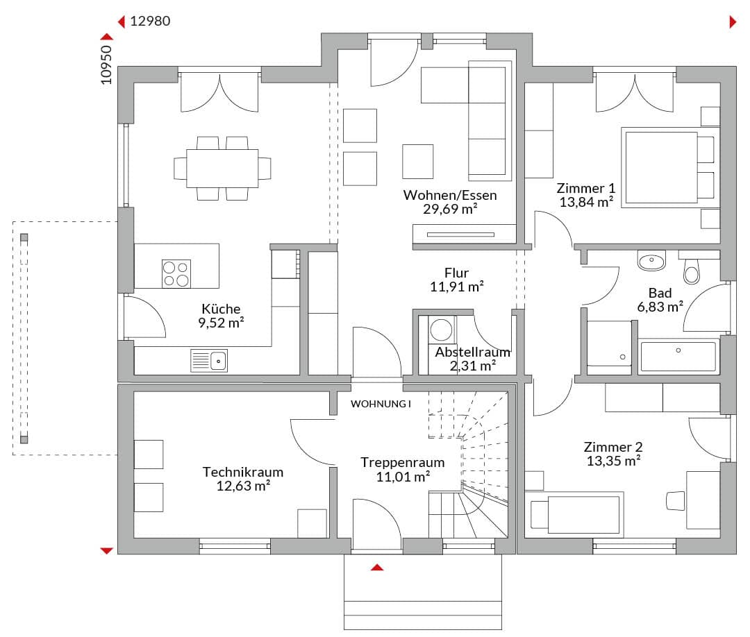 Gemeinsamer Zugang zu den Wohnungen, Treppenhaus und Technikraum für Wohnung 1+2 in gemeinsamer Diele.