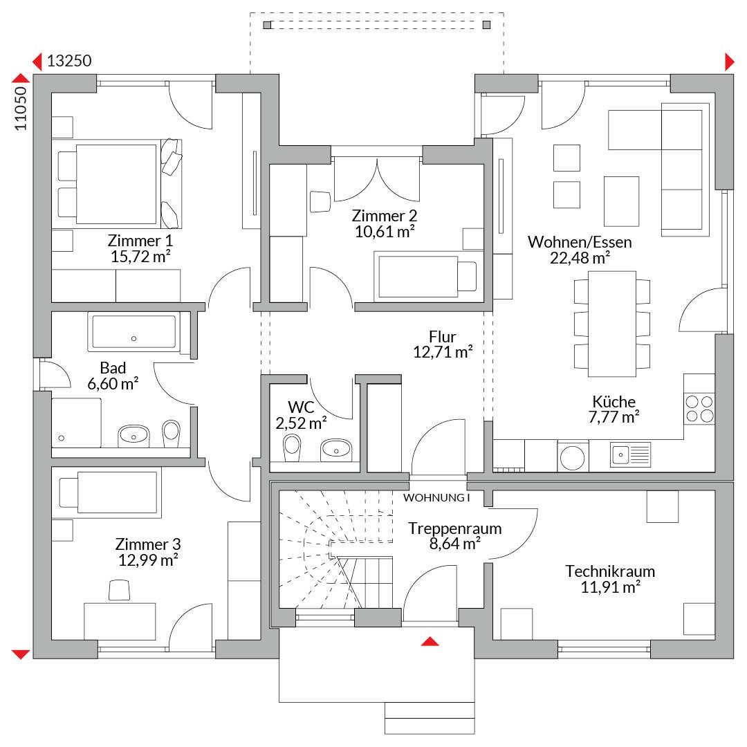 Wohnung 1 im Erdgeschoss: Wohnen/ Essen, offene Küche, Diele/Flur, Wannenbad, Gäste-WC, 3 Schlafzimmer, überdachte Terrasse durch eingerückte Außenwand.