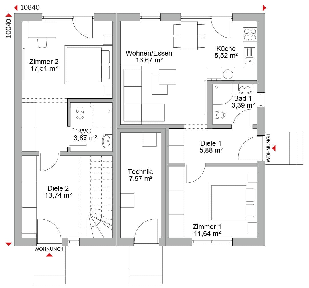 Eineinhalbgeschossiges Haus mit zwei Wohnungen. Separate Zugänge zu den Wohnungen. Externer Zugang zum gemeinsamen Technikraum. Satteldach mit 25° Dachneigung. Kniestock 1,75 m.