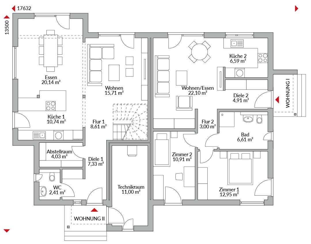 Eineinhalbgeschossiges Stadthaus mit zwei getrennten Wohnungen und separaten Zugängen. Externer Zugang zum gemeinsamen Technikraum. Satteldach mit 30° Dachneigung.