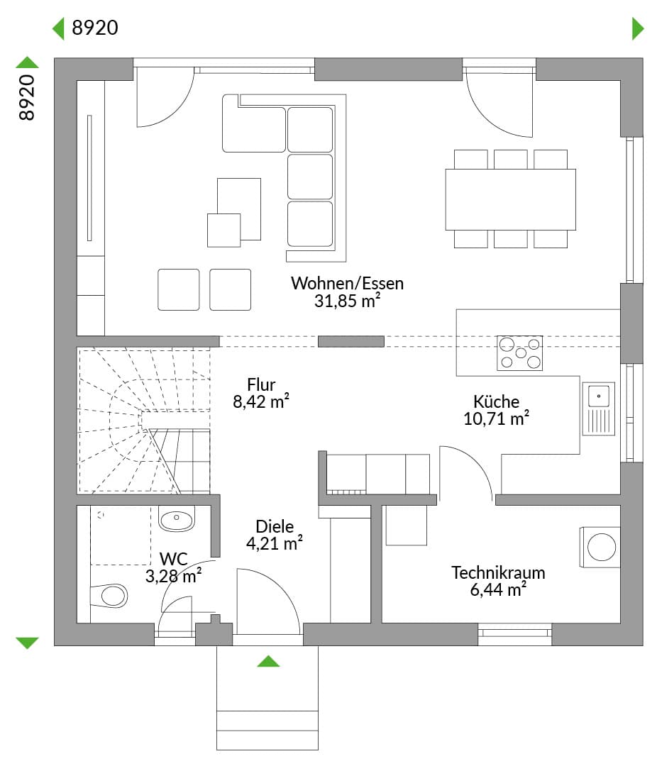 Modern, schick und hipp leben – diese Stadtvilla macht´s möglich. Die Architektur präsentiert sich zeitgemäß und leicht - mit zwei Vollgeschossen, ohne störende Dachschrägen und schlichtem Walmdach –so, wie junge Leute heute leben wollen. Unser Family 130 überzeugt mit ausgereiftem Grundrisskonzept. Familien mit zwei Kindern fühlen sich hier genauso wohl, wie Pärchen, die zuhause arbeiten wollen. Im Erdgeschoss werden durch die offene Wohn- und Esssituation mit anschließender Küche Geselligkeit und Kommunikation gefördert. Mit der Möglichkeit der Schaffung einer Kochinsel lassen sich bei der Küchenarbeit die Kinder im Blick behalten oder Freunde in das Kochevent einbinden.