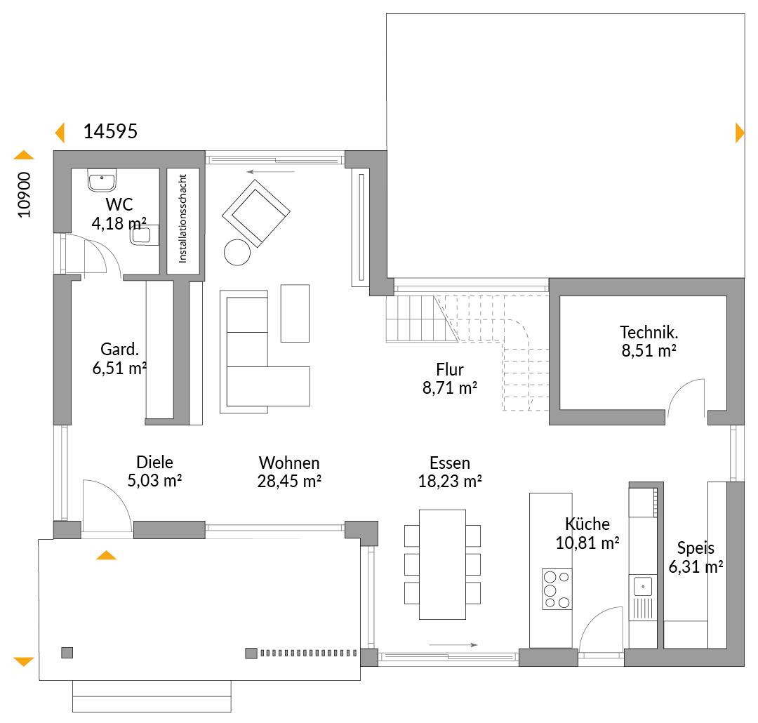Das Innere der modularen Flachdachvilla besticht durch ein klares und und funktionelles Konzept. Das weitgehend offen gestaltete Erdgeschoss ist dabei gut zoniert. Viel Stauraum bieten Diele und Speisekammer. Im Obergeschoss sind dem Masterschlafraum eine Ankleide und ein Bad angeschlossen, und für die zwei Kinderzimmer gibt es ein Extrabad. Praktisch: Der kleine Abstellraum. Schön: Die Empore mit Fernblick.