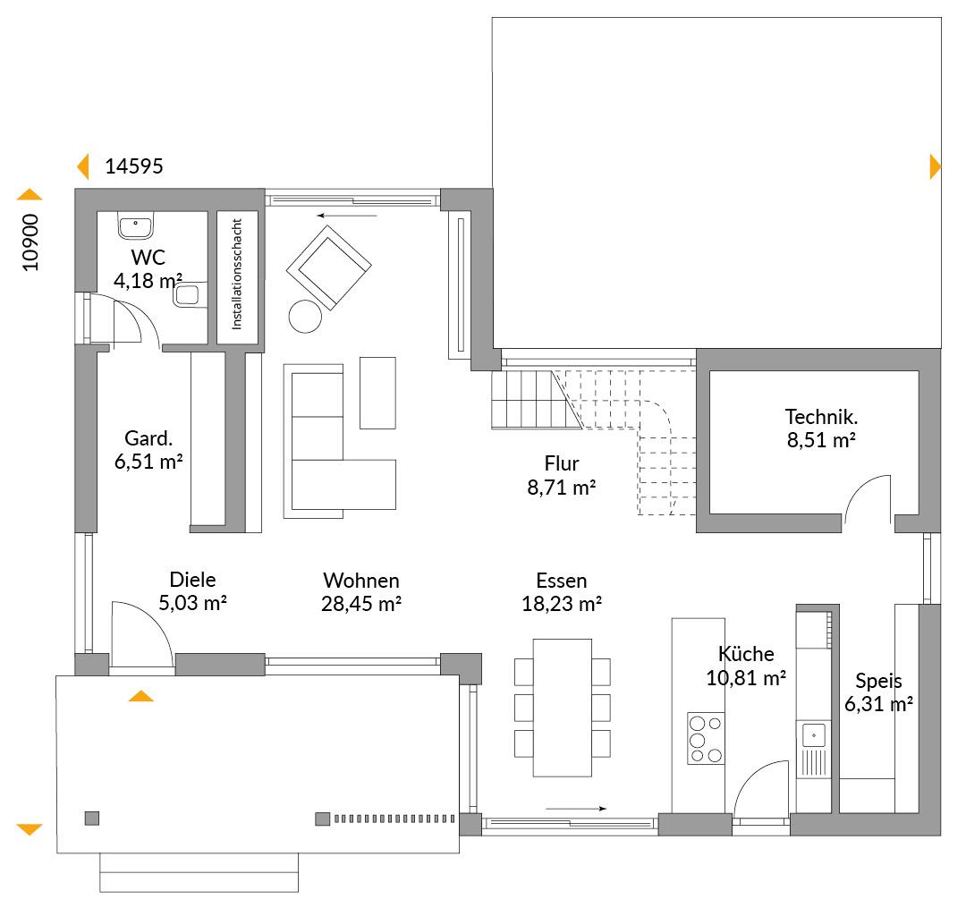 Flachdach und klare Linien verleihen der modularen Stadtvilla Bauhausflair. Versetzte Module schaffen gut nutzbare Areale im Außenbereich wie die überdachte Terrasse, den überdeckten Eingangsbereich und den über Eck laufenden Balkon. Raumhohe Fenster und generell viel Glas unterstreichen den schönen Anblick und sorgen für eine außerordentlich gute Belichtung der Innenräume.