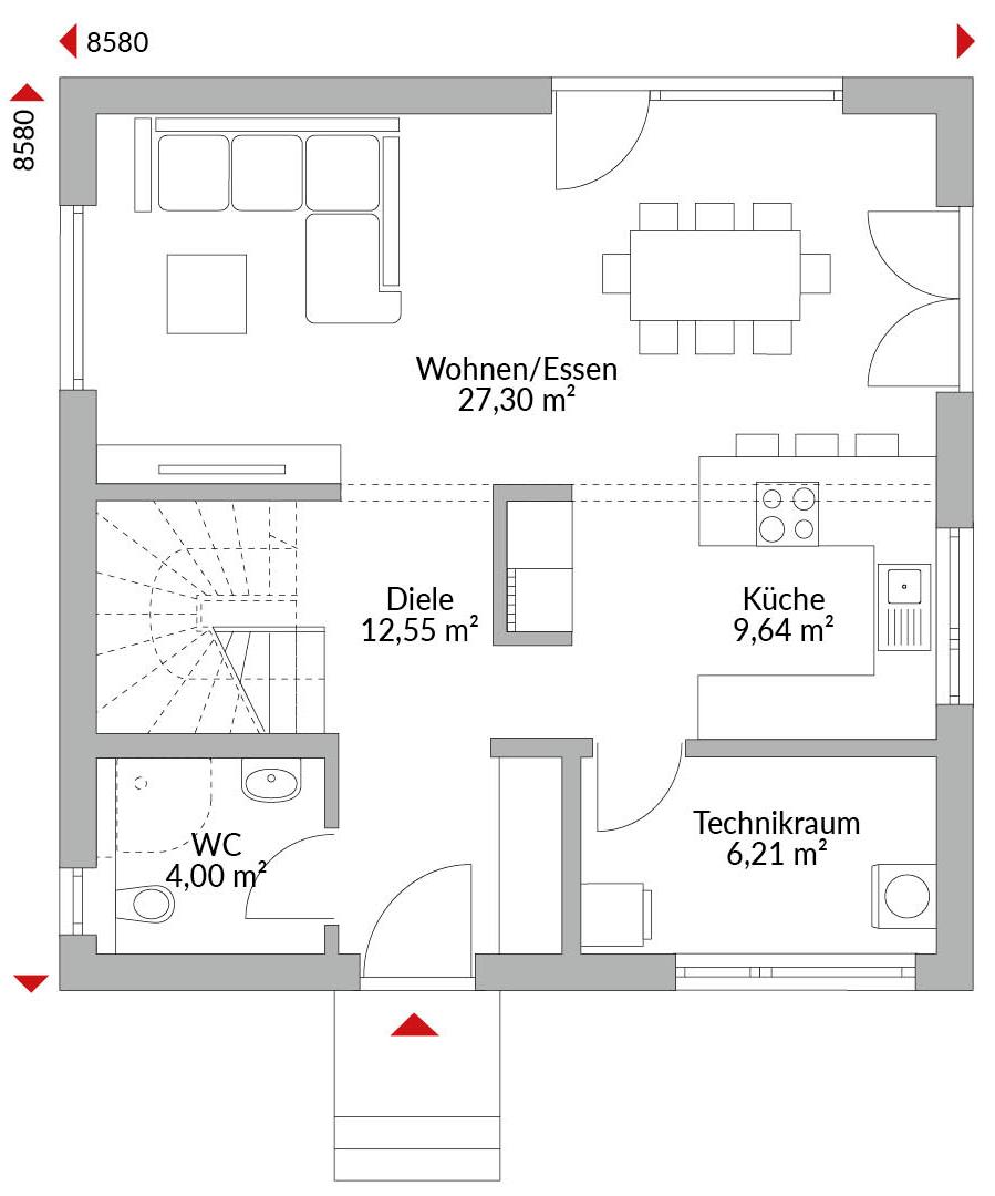 Zweigeschossiges Haus mit vier Zimmern, offener Küche, Bad, Gäste-WC, Technikraum und Diele, Zeltdach mit 22° Dachneigung.