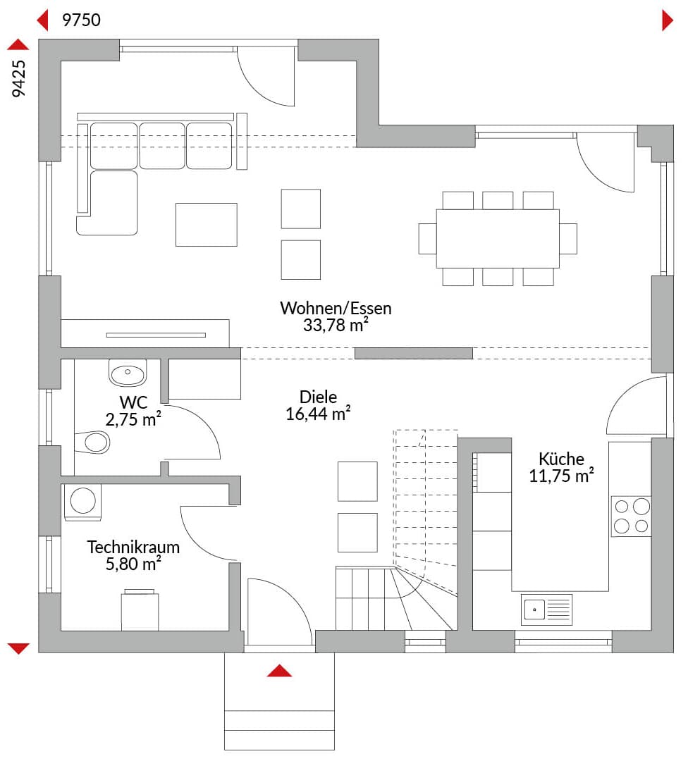 Zweigeschossige Stadtvilla mit drei Zimmern, offener Küche und geräumigem Wohn-/Essbereich, Bad, Gäste-WC, Technikraum und Diele, Flachdach.