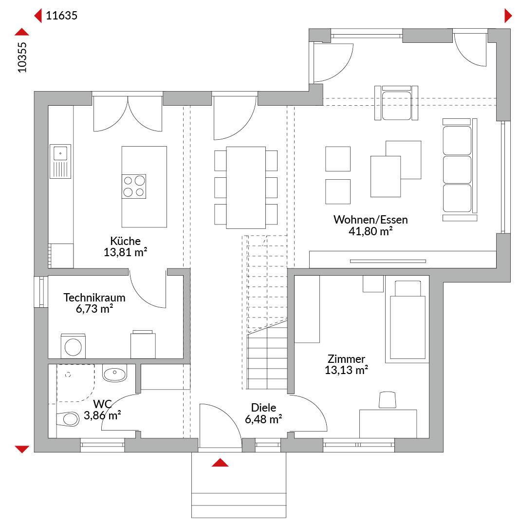Zweigeschossige Stadtvilla mit vier Zimmern, offener Küche, geräumigem Wohn-/Essbereich, Gäste-WC, Technikraum und Diele, Bad und Ankleide im Obergeschoss, Zeltdach mit 22° Dachneigung.