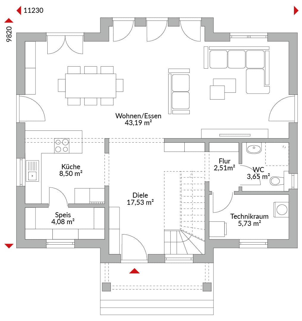 Zweigeschossige Stadtvilla mit drei Zimmern, offener Küche, Speisekammer, geräumigem Wohn-/Essbereich, Gäste-WC, Technikraum und Diele, Bad und großer Ankleide plus Abstellraum im Obergeschoss, Zeltdach mit 22° Dachneigung.